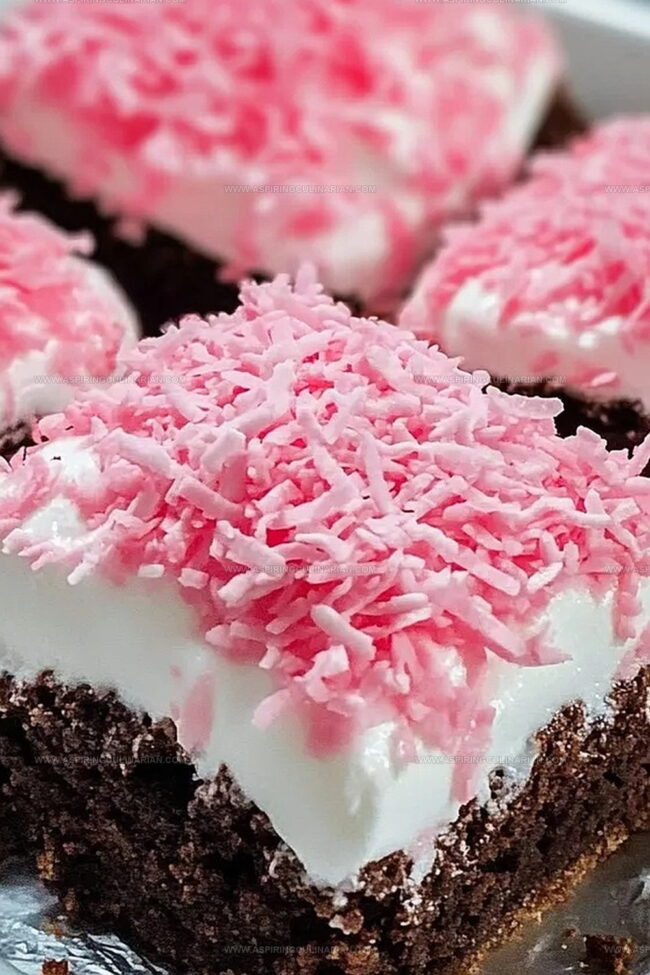 - Delicately scatter the pink coconut blend over the marshmallow layer, applying gentle pressure to ensure adherence.