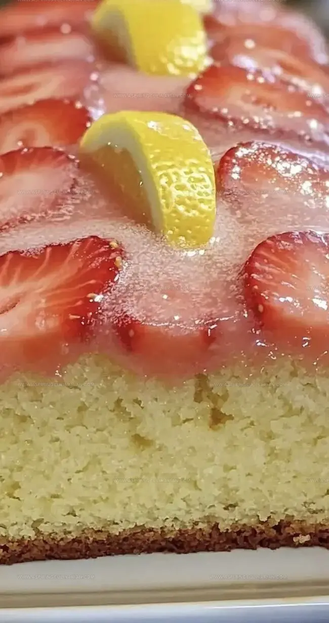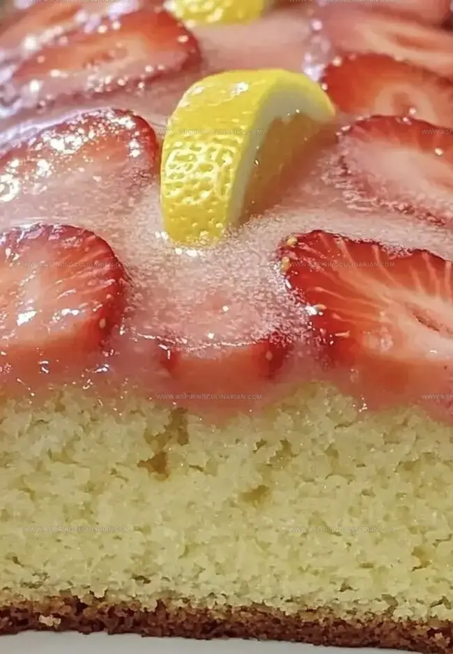 The cake combines the brightness of lemon with sweet strawberries, creating a refreshing and tangy dessert that balances citrus and fruity notes.