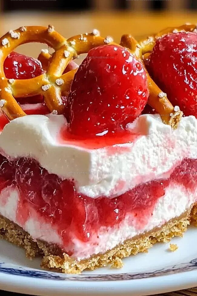 Crisp pretzel crusts create a unique foundation for silky cream cheese and vibrant strawberry gelatin.