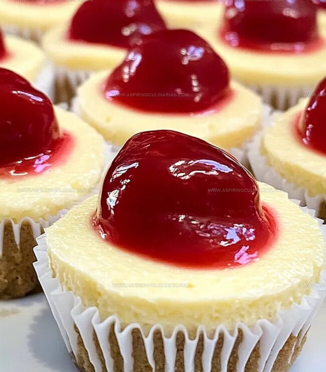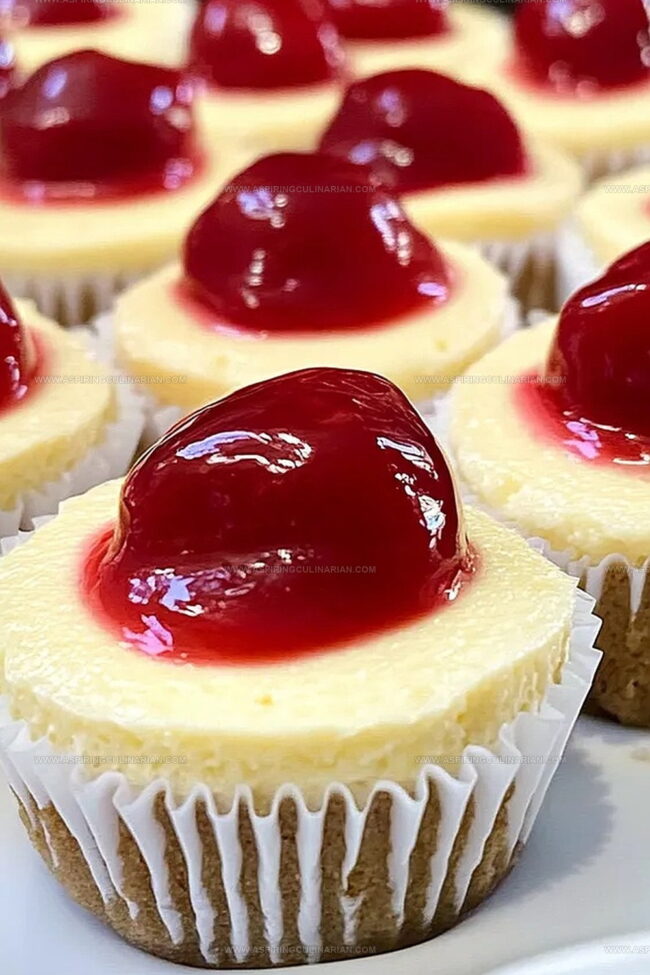 - Before serving, garnish each mini cheesecake with a generous spoonful of cherry pie filling. Arrange on a decorative platter and serve chilled for maximum enjoyment.