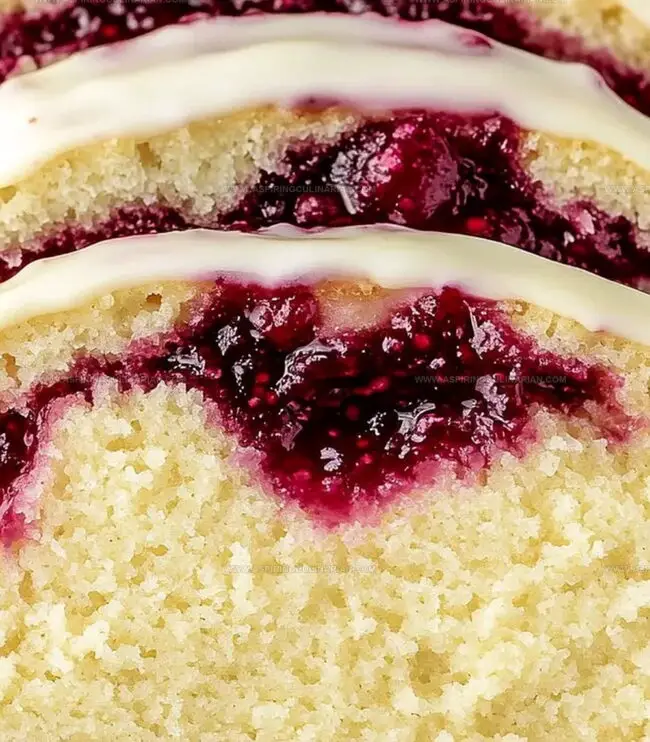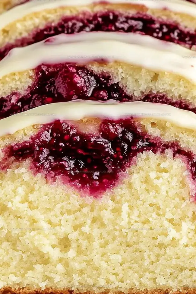 Decadent swirls of white chocolate dance through a moist raspberry loaf cake that promises pure indulgence.