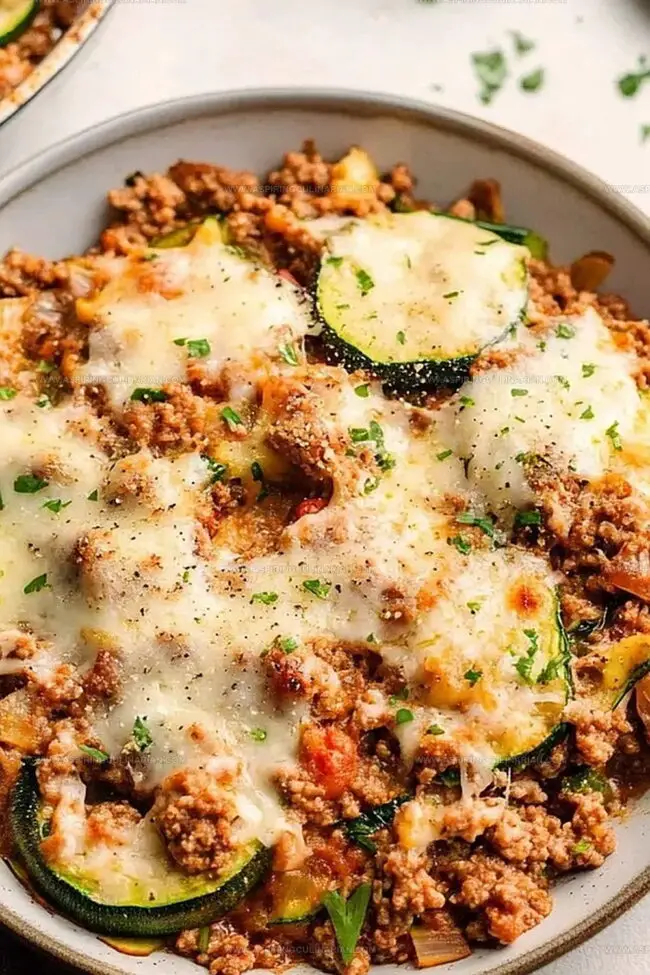 Layers of tender zucchini blend seamlessly with savory seasoned meat, creating a delightful one-dish wonder.